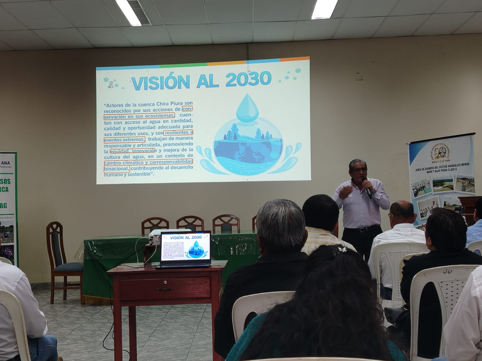 Jueves, 18 de Julio del 2024El presidente de la Junta de Usuarios del Sector Hidráulico Menor Medio y Bajo Piura Clase A, Ing. Macario Silva Vílchez, participó en la reunión convocada por el Consejo de Recursos hídricos de Cuenca Chira Piura, órgano permanente de la Autoridad Nacional del Agua, con el objetivo de socializar el Plan de Gestión de Recursos Hídricos de Cuenca Chira Piura 2023-2030; así mismo definir acciones conjuntas para su implementación.